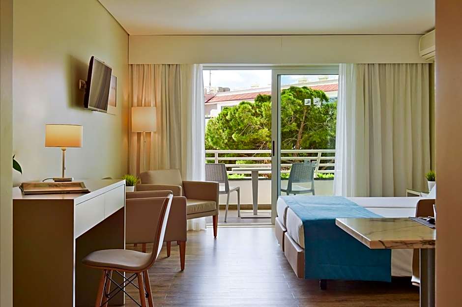 This recently-refurbished studio has modern equipment and furnishings. It has 2 single beds, a kitchenette and a private bathroom with free toiletries. The studio has a balcony overlooking the swimming pools.